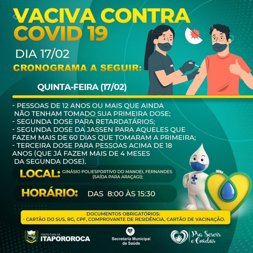 A Prefeitura Municipal de Itapororoca, através da Secretaria Municipal de Saúde, informa que nesta quinta-feira, dia 17/02, estará realizando mais um dia de vacinação contra a COVID-19, conforme cronograma a seguir: