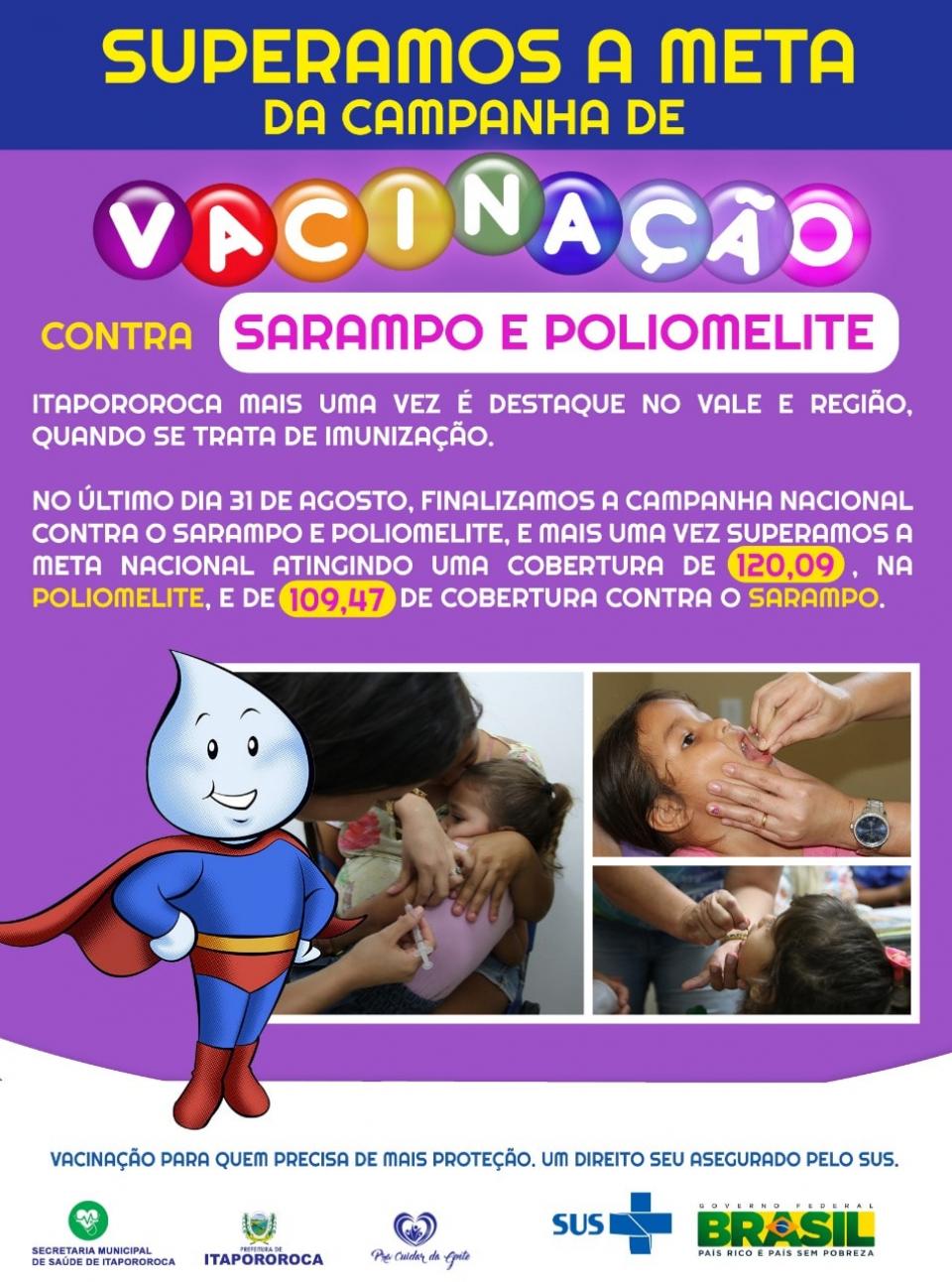 No último dia 31 de agosto, finalizamos a Campanha Nacional contra o Sarampo e Poliomelite, e mais uma vez superamos a meta nacional atingindo uma cobertura de 120,09, na Poliomelite, e de 109,47 de cobertura contra o Sarampo.