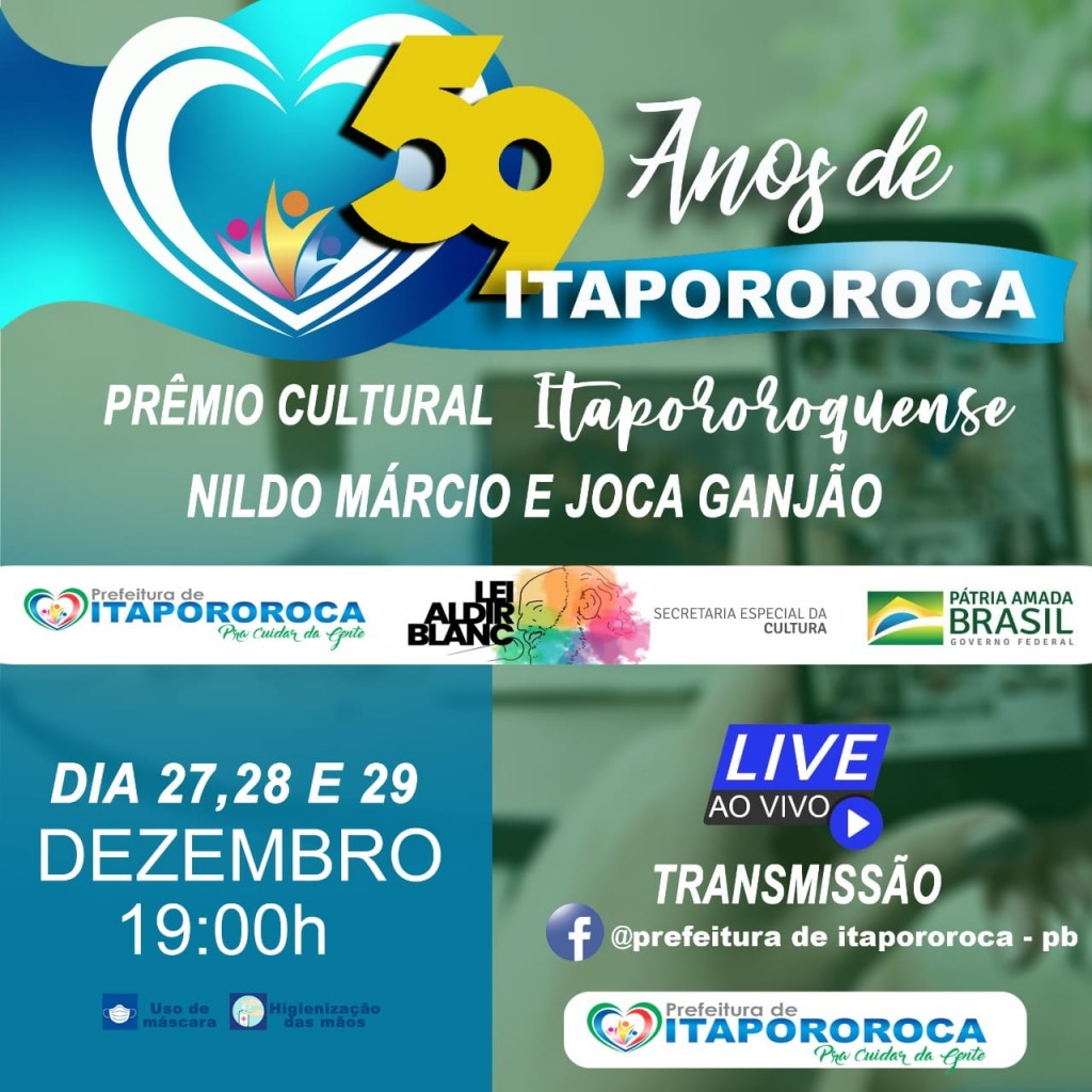 A Prefeitura Municipal de Itapororoca-PB, por meio do incentivo aos artistas locais proporcionado pelo Governo Federal, através da Lei Aldir Blanc, estará nos dias 27,28 e 29 de dezembro, transmitindo através de suas redes sociais lives com artistas locais, relacionadas ao referido prêmio.