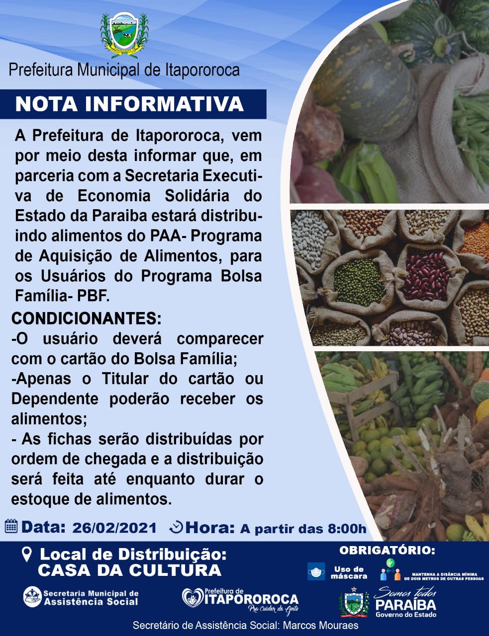 Prefeitura de Itapororoca em parceria com a CONAB estará distribuindo gêneros alimentícios do PAA- Programa de Aquisição de Alimentos amanhã dia 26/02/2021.