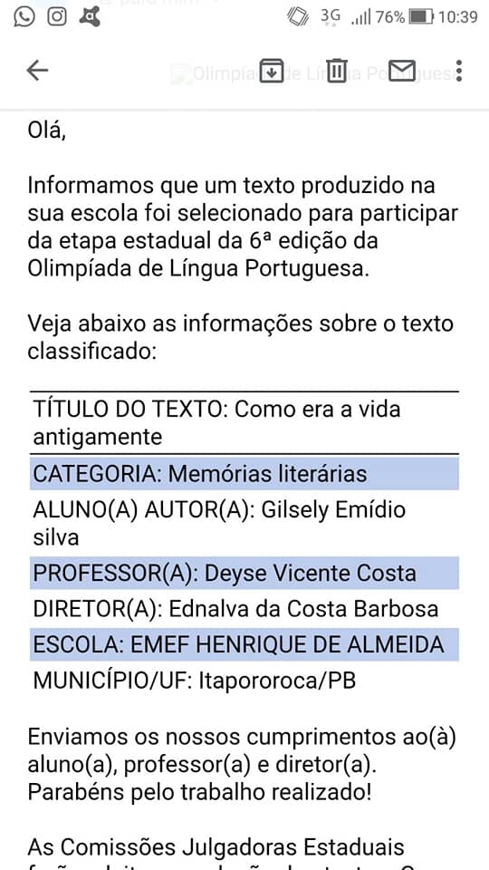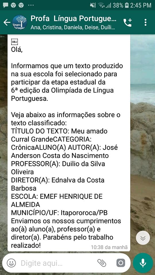 A Prefeitura Municipal de Itapororoca, por meio de sua Prefeita Constitucional, Elissandra Brito e do Secretário de Educação, Jhef Costa, parabenizam os alunos da rede municipal de Ensino, classificados na Olimpíada de Língua Portuguesa.