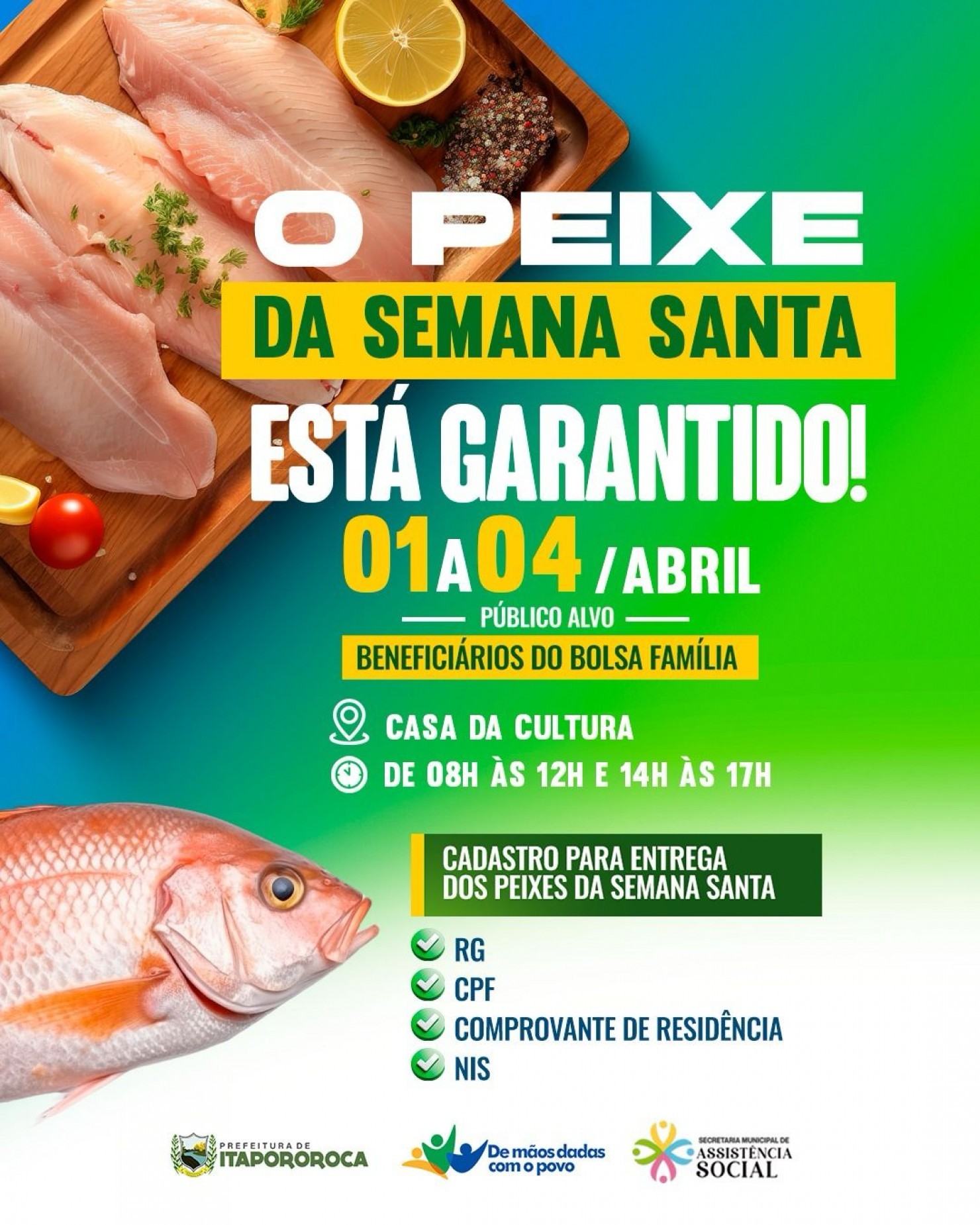 De 01 a 04 de abril, os beneficiários do Bolsa Família podem se cadastrar para receber o peixe.