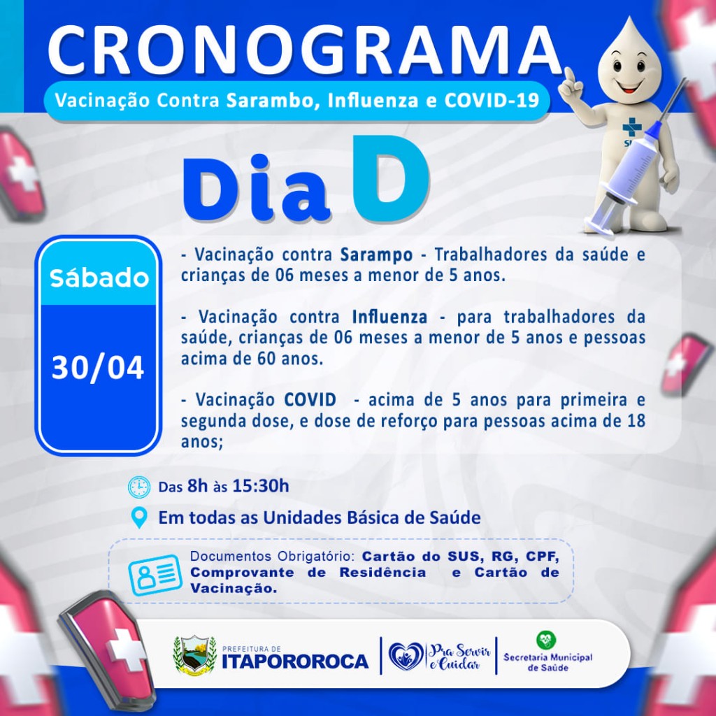 A Prefeitura Municipal de Itapororoca, através da Secretaria Municipal de Saúde, informa que neste sábado, dia 30/04, estará realizando um dia *D* de vacinação contra *Sarampo, Influenza e Covid-19*, conforme programação a seguir: