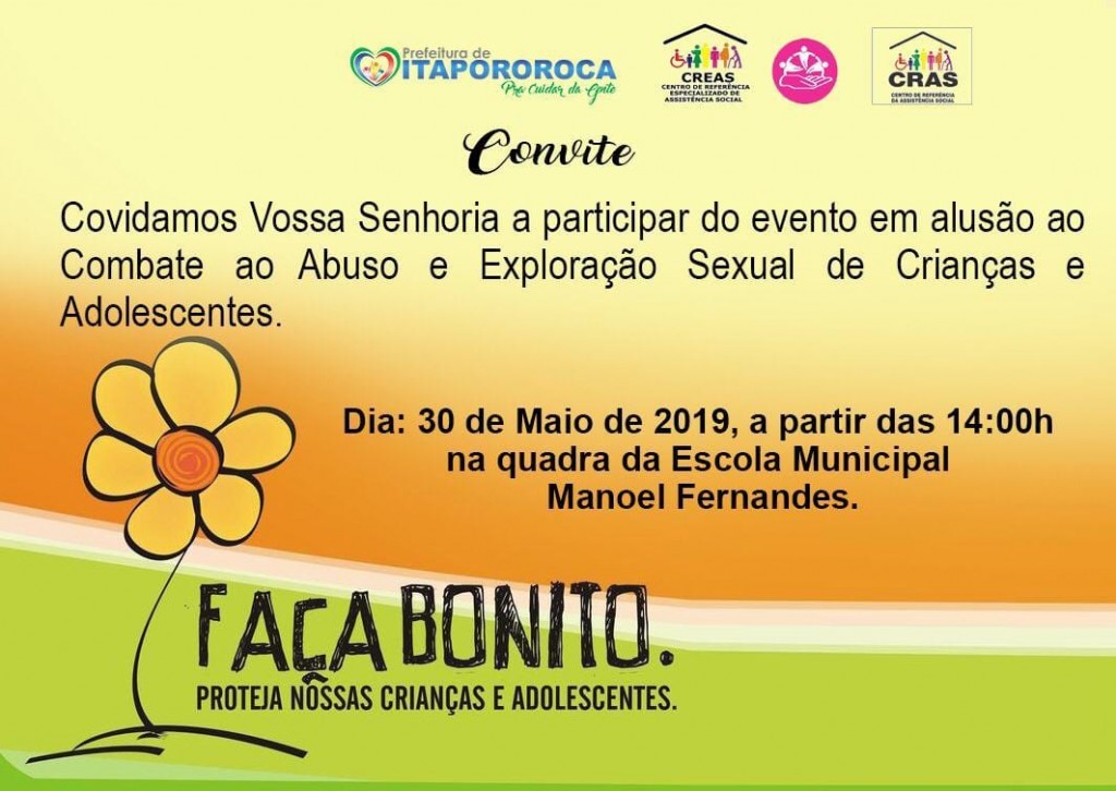 Mobilizar a sociedade civil organizada e convocá-la para o engajamento de ações contra a violência sexual de crianças e adolescentes. Esta é a proposta da Secretaria Municipal de Assistência Social de Itapororoca-PB, através do CREAS com a parceria do CRAS e Conselho Tutelar, ao realizar, neste dia 30/05 a partir das 14h, na quadra da Escola Manoel Fernandes evento alusivo ao" Dia Nacional de Combate ao Abuso e à Exploração Sexual de Crianças e Adolescentes.