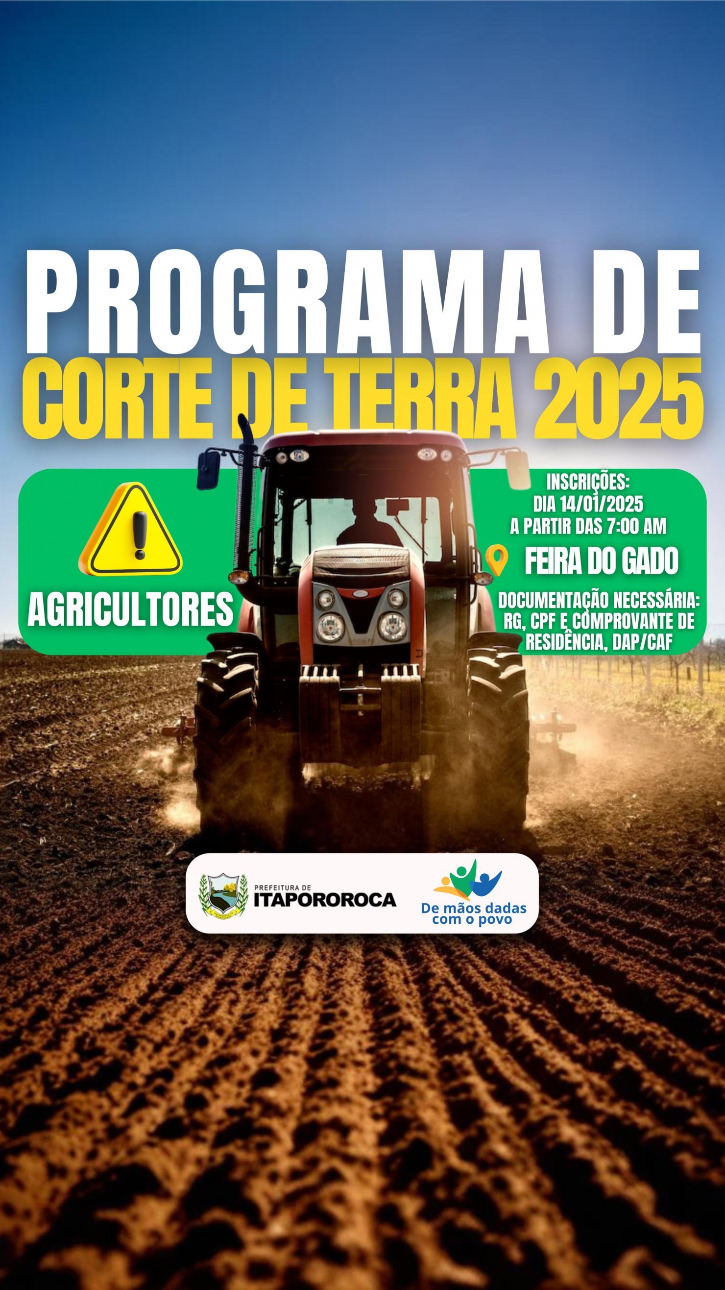 A Prefeitura de Itapororoca, através da Secretaria de Agricultura, informa que as inscrições para o Programa de Corte de Terra 2025 começam no dia 14/01/2025.