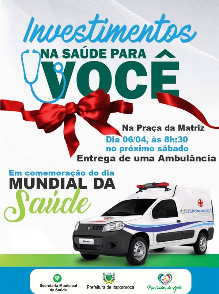 A Prefeitura de Itapororoca-PB, por meio da Secretaria Municipal da Saúde, adquiriu mais uma ambulância para o transporte intermunicipal de pacientes. A entrega ocorrerá no próximo sábado (06/04).