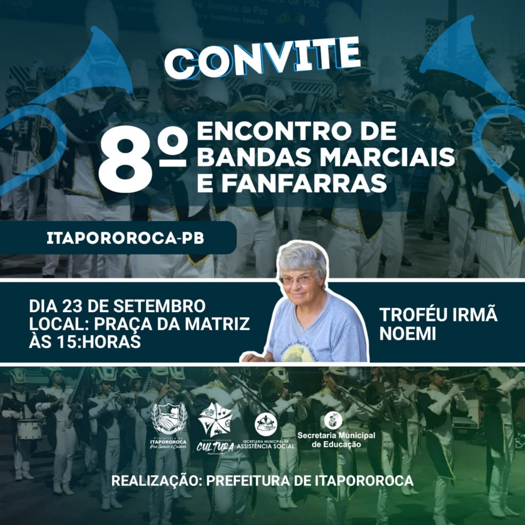 A Prefeitura de Itapororoca, através de sua Prefeita Constitucional, Elissandra Brito, vem por meio deste, convidar Vossa Senhoria e família, para juntos participarmos do 8° Encontro de Bandas Marciais e Fanfarras "Troféu Irmã Noemi" a realizar-se dia 23 de setembro, na Praça da Matriz, as 15h.