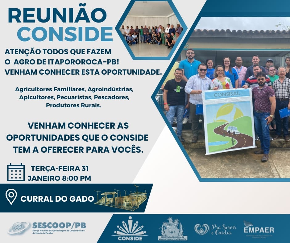 A Prefeitura de Itapororoca, através de Sua Secretaria de Agricultura e Desenvolvimento Econômico, junto com a EMPAER, convida a todos para juntos participarmos dessa importante reunião do CONSIDE- Consórcio Público Intermunicipal de Desenvolvimento Rural e Econômico das Regiões da Zona da Mata, Brejo, Agreste e Curimataú Paraibano.