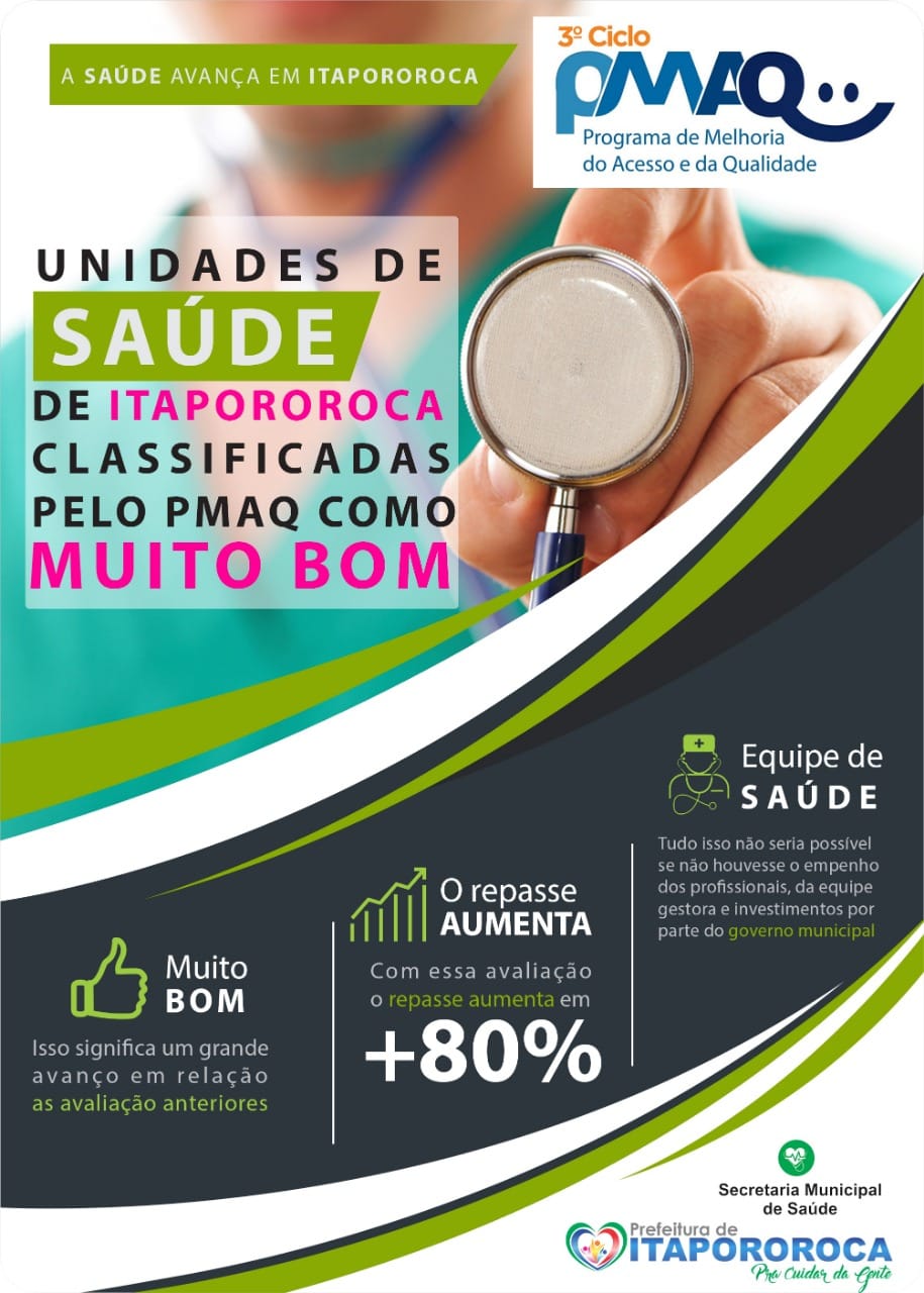 Nosso município foi avaliado e tivemos uma ascensão na certificação da maioria das equipes de Saúde da Família e equipe do Nasf, sendo classificadas como “Bom” e “Muito Bom”. Isso significa um grande avanço em relação as avaliações anteriores, o que resultará em um aumento de mais de 80% no repasse do programa.