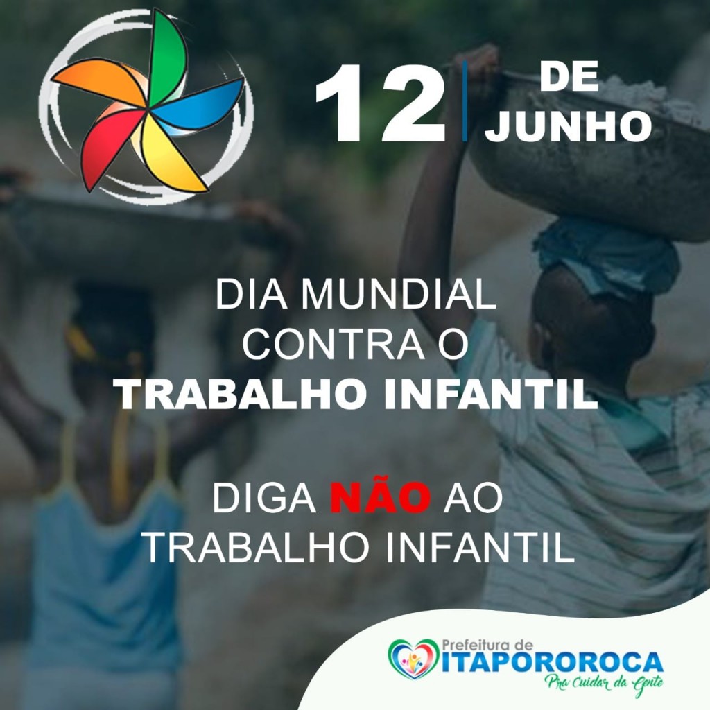 Prefeitura de Itapororoca-PB, por intermédio da Secretaria Municipal de Assistência Social (SMAS), estará divulgando hoje (11) e amanhã sexta-feira (12), materais virtuais com orientações alusivas ao 12 de junho – Dia Mundial Contra o Trabalho Infantil. Este ano, a iniciativa traz como tema “Agora mais do que nunca, todos contra o Trabalho Infantil”. A ação integra as políticas da Assistência Social implementadas pela Gestão "Pra Cuidar da Gente" e tem como objetivo sensibilizar a sociedade que o trabalho infantil prejudica, é crime e compromete o desenvolvimento da criança.